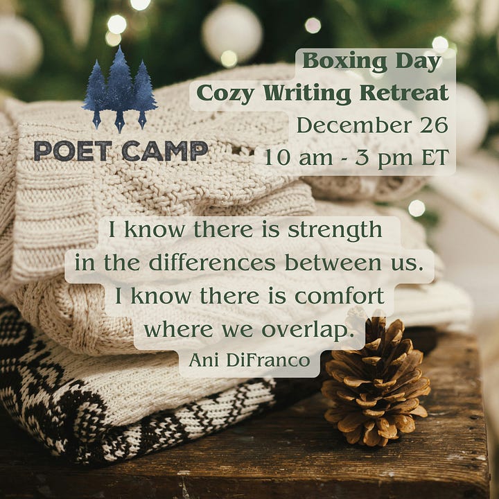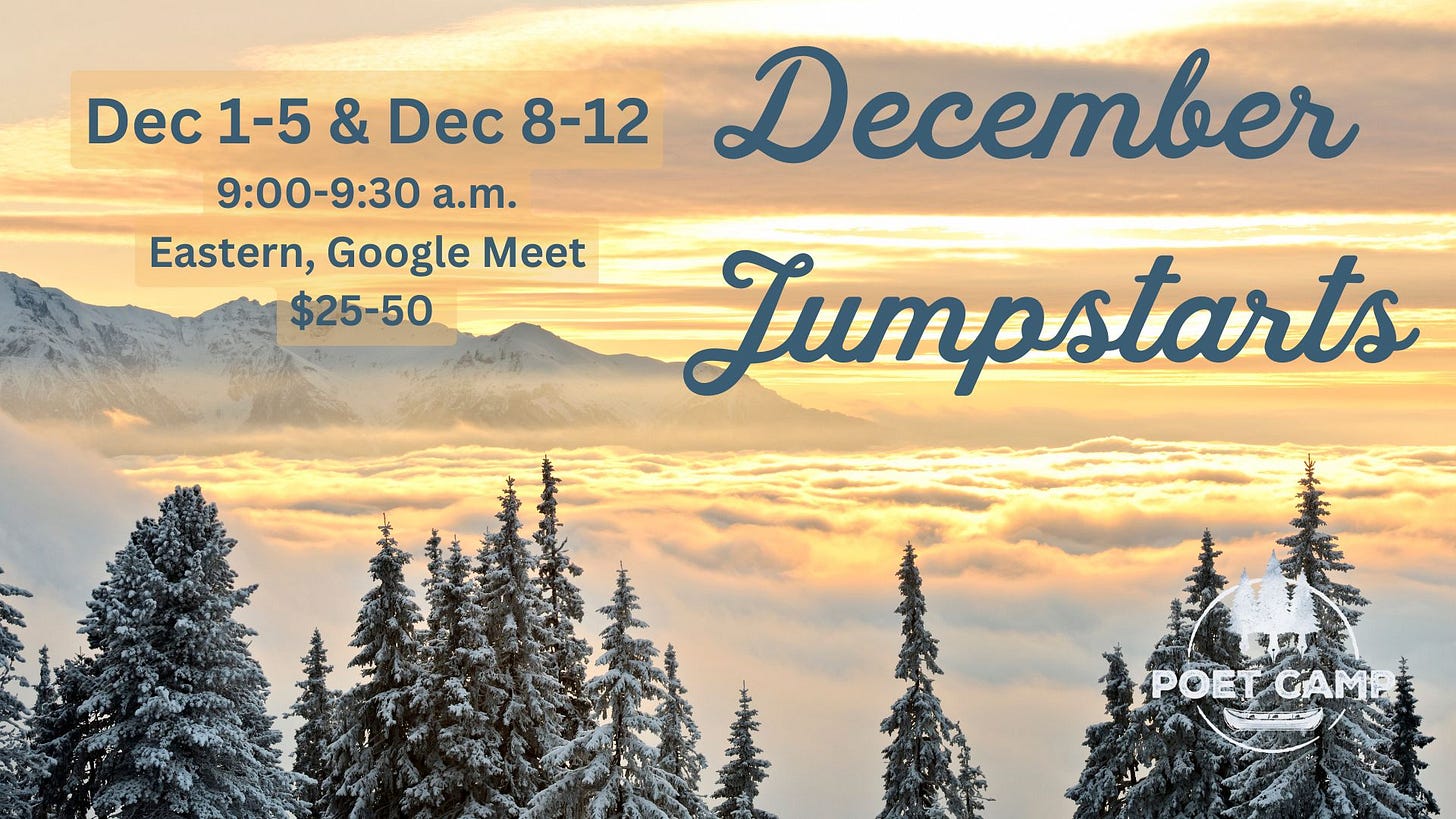 And last but not least, I hope you’ll also consider signing up for something at Poet Camp, and maybe buying a seat for a friend. This is the last call for the December Jumpstarts, which begin Monday, December 1! The Boxing Day Cozy Writing Retreat will happen as usual on December 26. *Either use the donation link, or sign up for a specific event with a note that this is a gift, and I’ll send them a customized “card.”